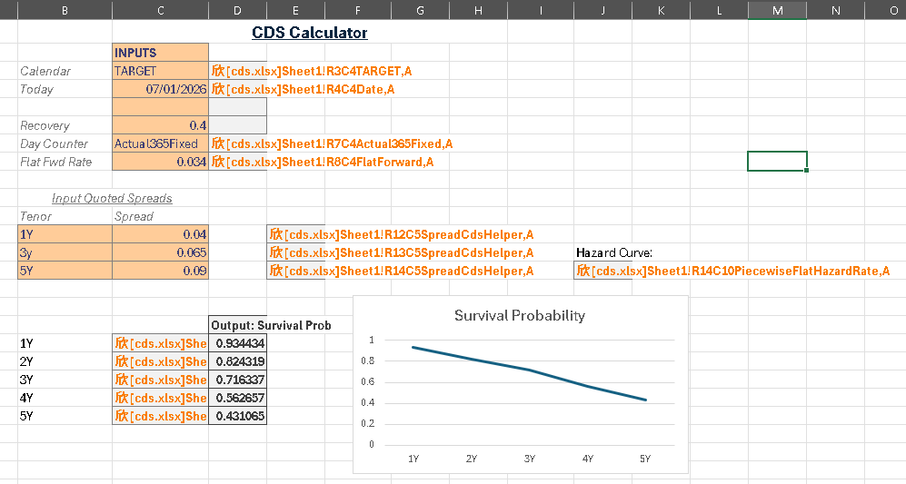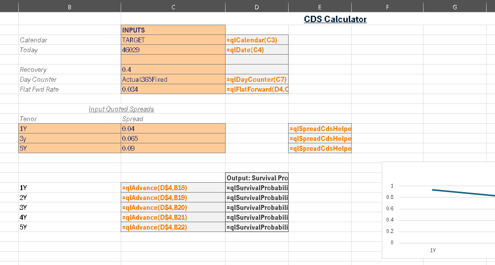 As an illustration of how xlOil, Python and QuantLib can be used together, below are images of a spreadsheet which is a port of the QuantLib CDS example. In this case input CDS quoted spreads and assumed recovery rate are used to build a hazard curve which is then used to predict survival.
