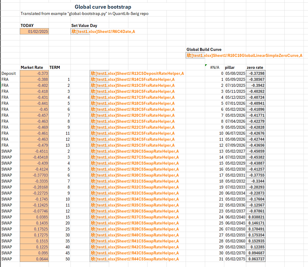 The recommended approach to using QuantLib from Microsoft Excel is through xlOil (xlOil source) which is connected to a Python interpreter running the offical QuantLib Python wrappers. The advantage of this approach: